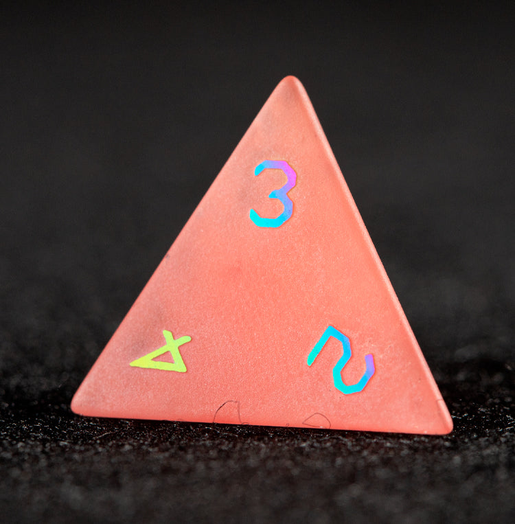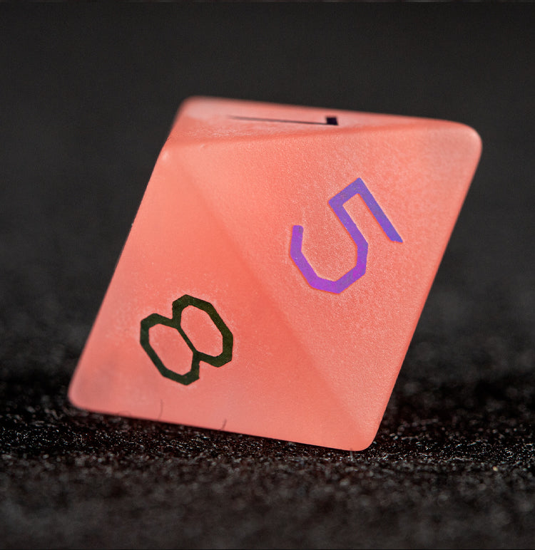 Vibrant yet refined, playful yet radiant, and finished with a luminous plated sheen — the Watermelon Red Glass Plated 7-Piece Polyhedral Dice Set embodies vitality, luck, and joyful momentum. Each die features translucent watermelon red glass panels enhanced with a polished electroplated finish, evoking summer light, lively sparks, and the thrill of decisive rolls.
